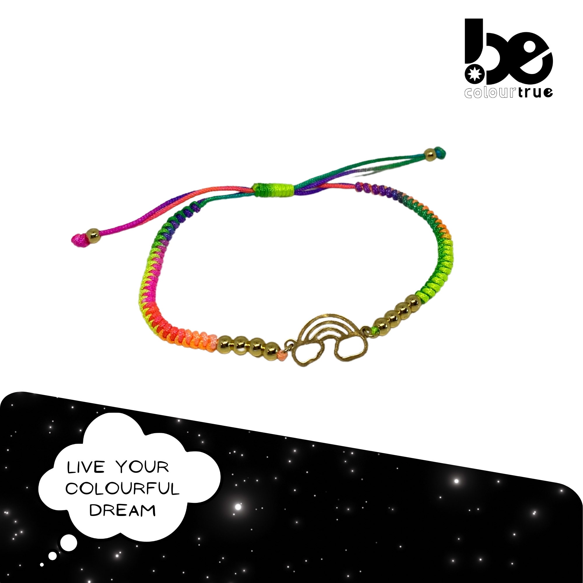 Duik in onze excentrieke armband: knallende kleuren, ‘n gouden wolkje & ‘n regenboog bedeltje. Hij past om elke pols. 💫